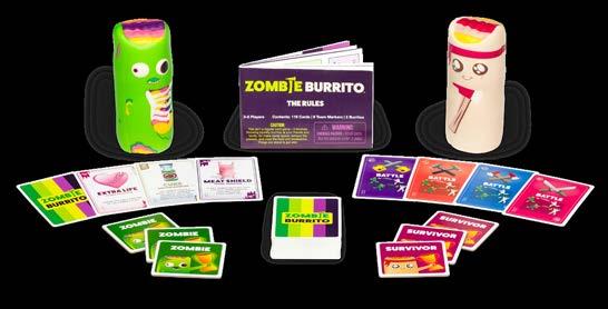 This is the ghouly version of our bestselling game, Throw Throw Burrito featuring allnew twists. Each game involves two teams, Zombies and Survivors. Pick your side, then work to collect sets of 3 matching cards. Some cards give Survivors special abilities, some help out the Zombies, and some incite an epic battle between the living and the undead. During a battle, it’s up to you and your teammate to knock out your opponents with a squishy Burrito. The first team to win 3 Battles wins the game!