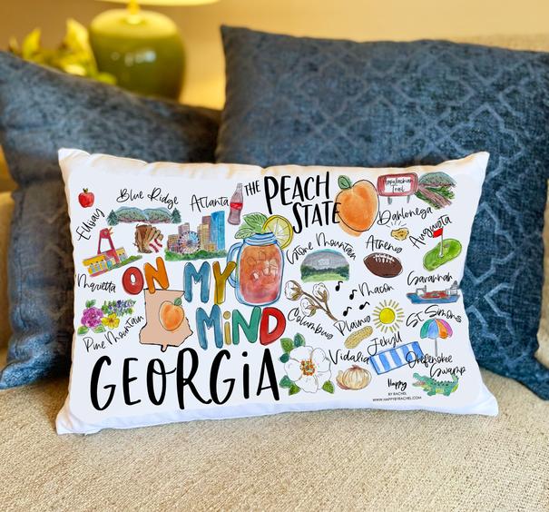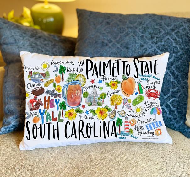 EACH PILLOW CONTAINS HAND DRAWN ORIGINAL ARTWORK SPECIAL TO EACH STATE. DOUBLE SIDED & WASHABLE. MEASURES 10X18.