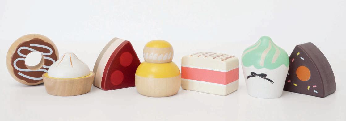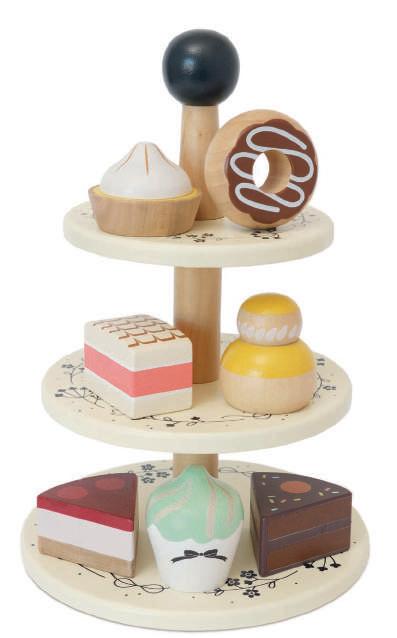 Our lovely Three Tier FSCTM - Certified wooden Cake Stand with a selection of 7 delectable, sweet treats is perfect for any occasion. Each tier of this beautifully art-worked cake stand features a different mouth-watering delight. Let taste buds dance as you indulge in a lemon and cream choux bun, a zesty lemon meringue tart, chocolate doughnut, three-layered cake, cupcake, raspberry cream cake, and a chocolate cake. All pieces are decorated in non-toxic waterbased or stained paints for safe play.