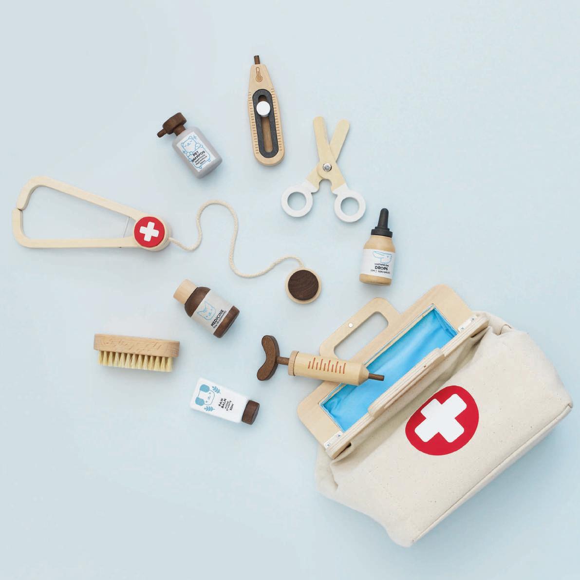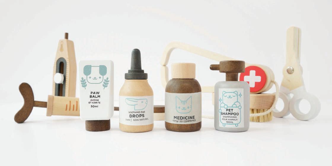 Featuring a sleek walnut stain finish and adorned with touches of natural FSCTM - certified wood, the 10 accessories forming this set are unlike any others. Items included are: soothing paw balm, ear drops, medicine bottle, pet shampoo, stethoscope, dressing scissors, a syringe, and a soft eco bristle brush. We are proud of the fact that this set is plastic free! Bring the world of career-based roleplay into any home with this perfect set.
