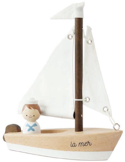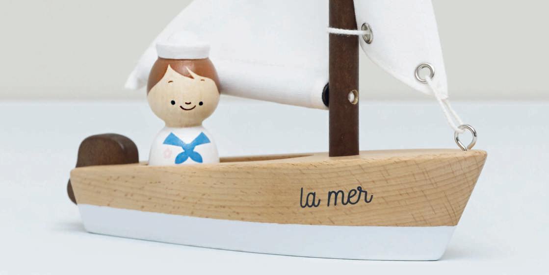 Our FSC™ - certified wooden Sailing Boat is a nautical gem, handcrafted to perfection. Full of timeless charm, it is crafted from beechwood with walnut stained parts. The additional cotton flag and sails gracefully billow with the wind and propel the boat to boundless horizons, adding to the imaginative play value of this toy.