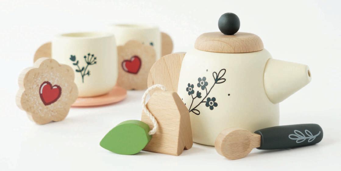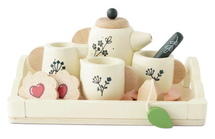 This 12 piece set includes everything your little one needs to host their own delightful tea party. It features beautifully crafted wooden cups and saucers, a charming tea pot, tea bag, a dainty milk jug, and even sugar-coated biscuits for an authentic teatime experience. The serving tray is adorned with charming flora details, adding a sense of style to the convenience and portability of the set. All wooden parts are made of FSCTM - certified wood.
