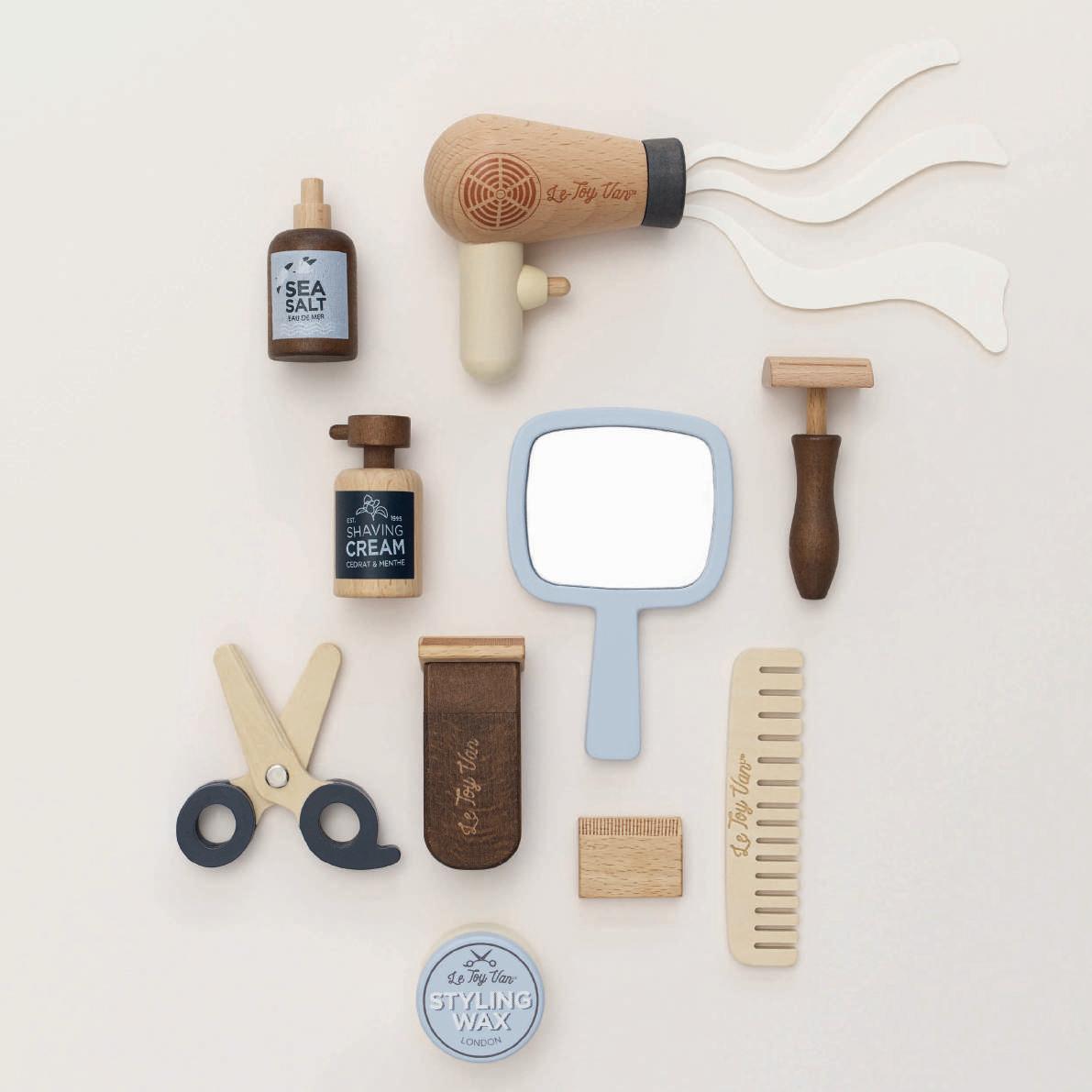 Our exquisite Wooden Barber Set is crafted with precision. This special grooming kit seamlessly combines natural wood touches, pastel water-based paints, and stunning stained walnut finishes. FSCTM - certified wood is used throughout this set. Our set includes 10 meticulously designed accessories, such as a beautifully crafted comb, professional hairdryer, scissors, handheld mirror, hair clippers with interchangeable magnetic blades, vintage-style razor, shaving foam, styling wax, and sea salt spray. Amazingly, the entire set all fits in the storage cotton drawstring bag provided. Our Wooden Barber Set is a true treasure for little ones!