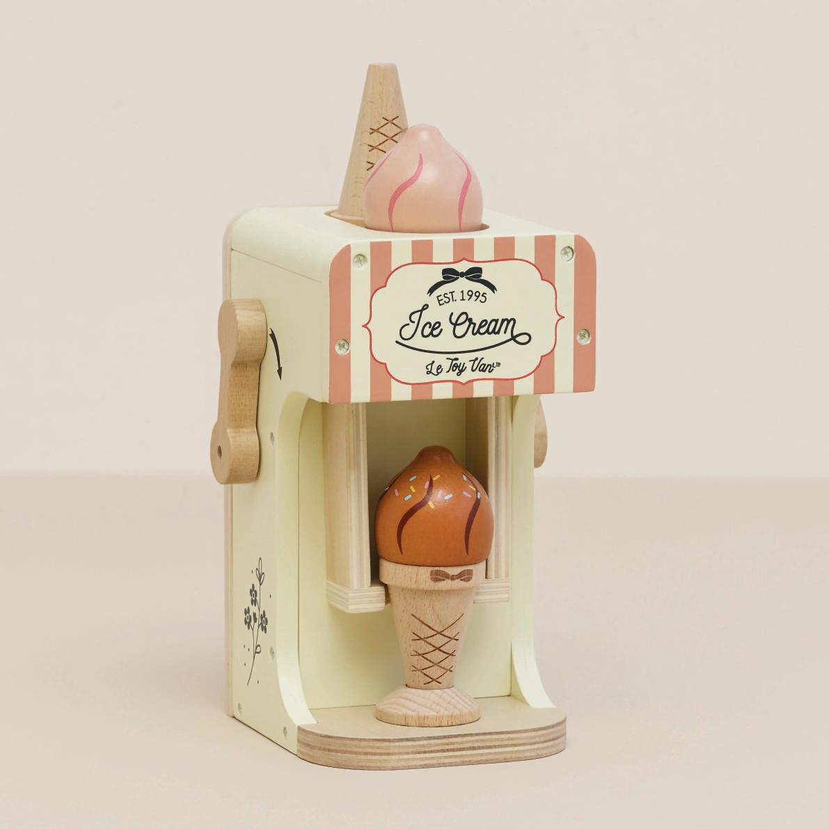 This pastel-coloured ice cream machine has retro charm, perfect for imaginative role play! The set includes two wooden engraved ice cream cones, along with strawberry and chocolate stainpainted ice cream toppers, a lever dispensing handle for imaginary dispensing, and a flavour switch.