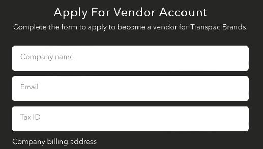 Select “Apply For Vendor Account” to register for an outline account. Once approved, you will receive an access email and be able to shop from all four Transpac Brands. You will not be able to view pricing or catalogs until your account has been approved.