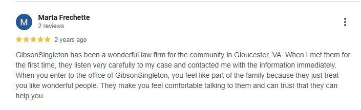 GibsonSingleton has been a wonderful law firm for the community in Gloucester, VA. When I met them for the first time, they listen very carefully to my case and contacted me with the information immediately. When you enter the office of GibsonSingleton, you feel like part of the family because they just treat you like wonderful people. They make you feel comfortable talking to them and can trust that they can help you.