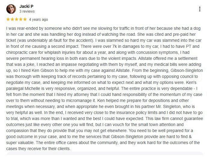 in both ears due to the violent impacts Allstate offered me a settlement that was a joke, I reached an impasse negotiating with them by myself, and my medical bills were adding up, so I hired Ken Gibson to help me with my case against Allstate From the beginning, Gibson-Singleton was thorough with keeping track of records pertaining to my case, following up with opposing council to negotiate my case, and keeping me informed on what to expect next and what my options were Ken's paralegal Michelle is very responsive, organized, and helpful The entire practice is very dependable - I felt from the moment that I hired my attorney that I could hand responsibility of the momentum of my case over to them without needing to micromanage it Ken helped me prepare for depositions and other meetings when necessary, and when appropriate he even brought in his partner Mr Singleton, who is very helpful as well In the end, I received very close to the insurance policy limits and I did not have to go to trial, which was more than I wanted and the best I could have expected. This law firm cannot guarantee outcomes just like every other one you will find, but I can vouch for the small town attention and compassion that they do provide that you may not get elsewhere. You need to be well prepared for a good outcome in your case, and to me the services that Gibson-Singleton provide are hard to find & super valuable. The entire office cares about the community, and they work hard for the outcomes of the cases they receive for their clients.