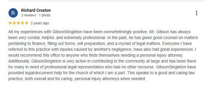Allmy experiences with GibsonSingleton have been overwhelmingly positive. Mr. Gibson has always been very cordial, helpful, and extremely professional. In the past, he has given good counsel on matters pertaining to finance, filling out forms, will preparation, and a myriad of legal matters. Everyone I have referred to this practice with injuries caused by another's negligence, have also had great experiences. I would recommend this office to anyone who finds themselves needing a personal injury attorney. Additionally, GibsonSingleton is very active in contributing to the community at large and has been there for many in need of professional legal representation who had no other recourse. GibsonSingleton have provided legal/document help for the church of which I am a part. This speaks to a good and caring law practice, both overall and for caring, personal injury attorneys when needed.