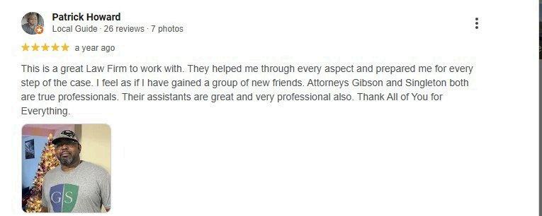 This is a great Law Firm to work with They helped me through every aspect and prepared me for every step of the case I feel as if I have gained a group of new friends Attorneys Gibson and Singleton both are true professionals Their assistants are great and very professional also Thank All of You for Everything