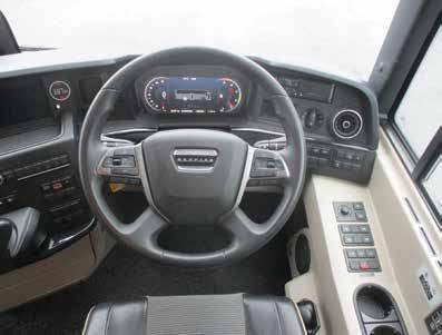 Drivers report impressive power and the software between the engine and the gearbox is well matched with none of the delay and shunt that’s associated with some coaches. Taking an example for a test drive along the M4, I can wholeheartedly confirm that this coach is solid on the road with no wandering or weaving from the rear-end. With light rain falling during our drive, we found that the large windscreen is easily cleaned by the big sweep of the wipers. Effective demisters and easily controlled air-con create a comfortable working environment for the driver and those on board. The driver’s area is compact but not too small, as everything can be reached easily, and it is not difficult to monitor the cluster. Notable also is that while some coach builders seem to compromise on the space for the tour guide, those travelling in the front of these Tourliners will be quite happy with their surroundings.