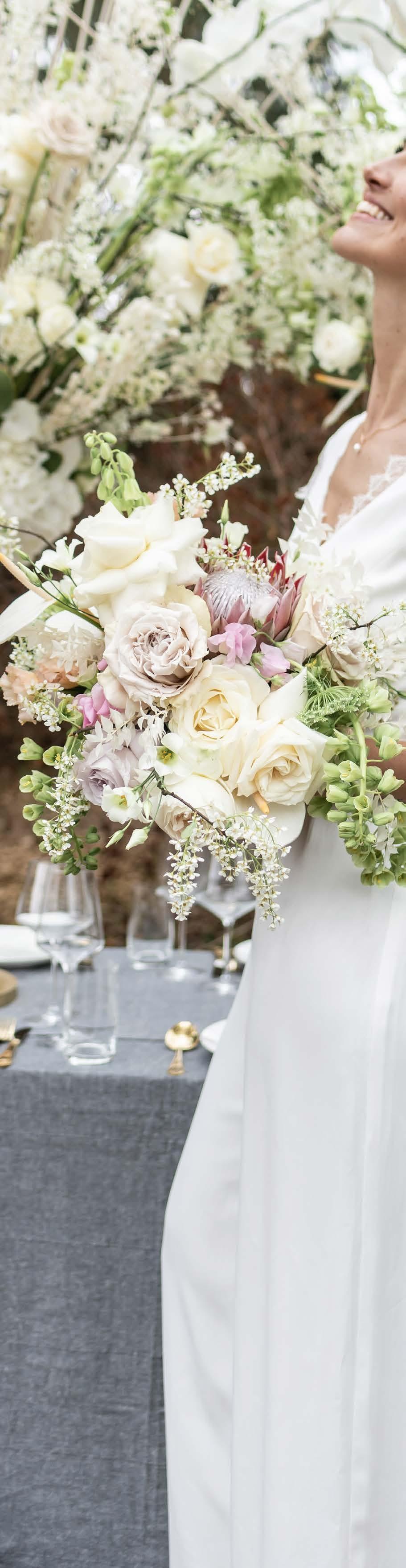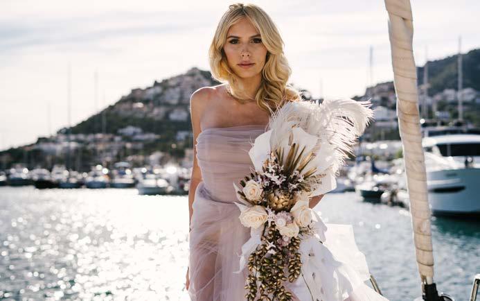 The bouquets are the showstopper in this theme. For an Italian wedding, large pastel pink bouquets full of roses and callas are the perfect choice. Complement the Country style wedding with a bouquet of roses in white and earthy colours, such as yellow, green and brown, matching the surroundings. For the Mallorca yacht wedding, choose an elongated bouquet with roses combined with luxurious and exotic flowers, such as the protea and palm leaves.