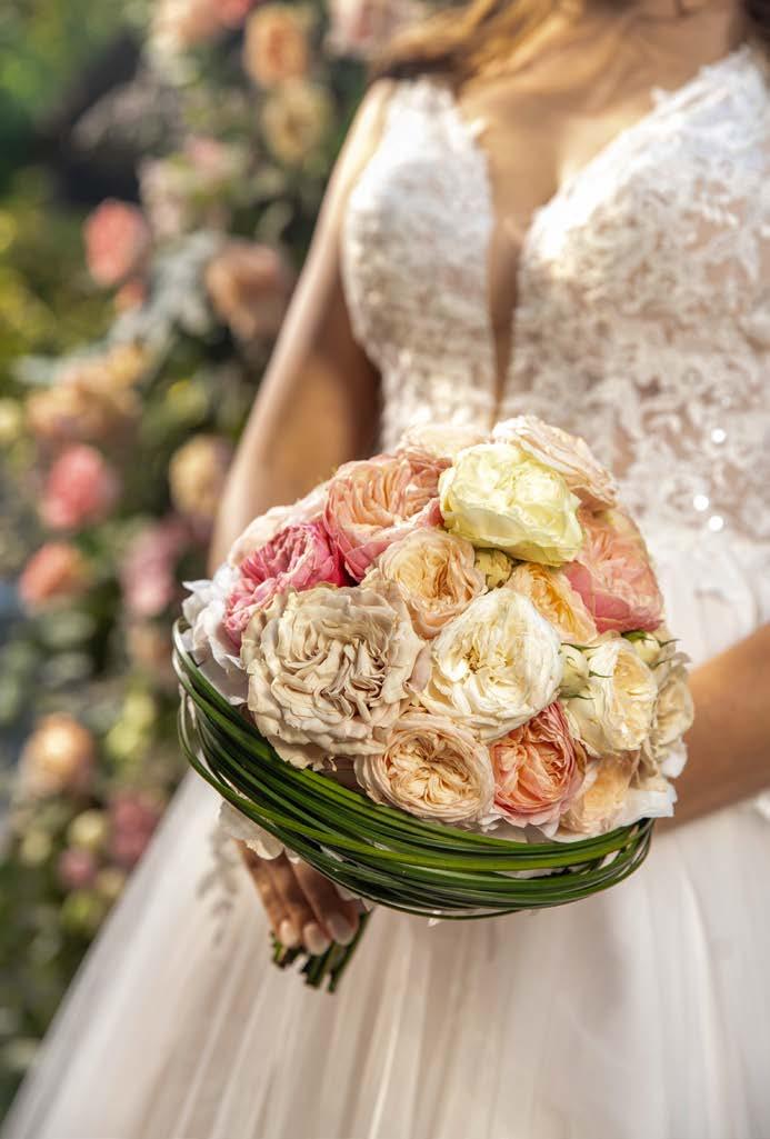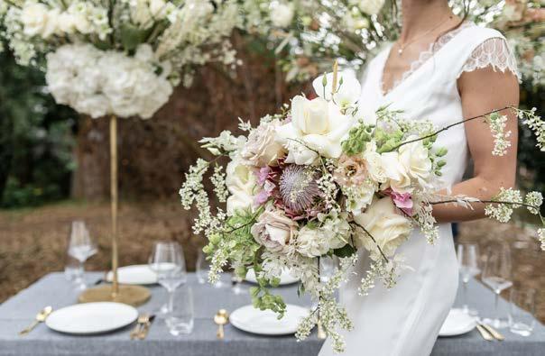 The bouquets are the showstopper in this theme. For an Italian wedding, large pastel pink bouquets full of roses and callas are the perfect choice. Complement the Country style wedding with a bouquet of roses in white and earthy colours, such as yellow, green and brown, matching the surroundings. For the Mallorca yacht wedding, choose an elongated bouquet with roses combined with luxurious and exotic flowers, such as the protea and palm leaves.