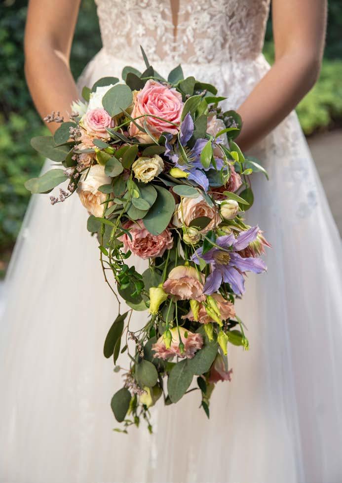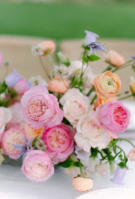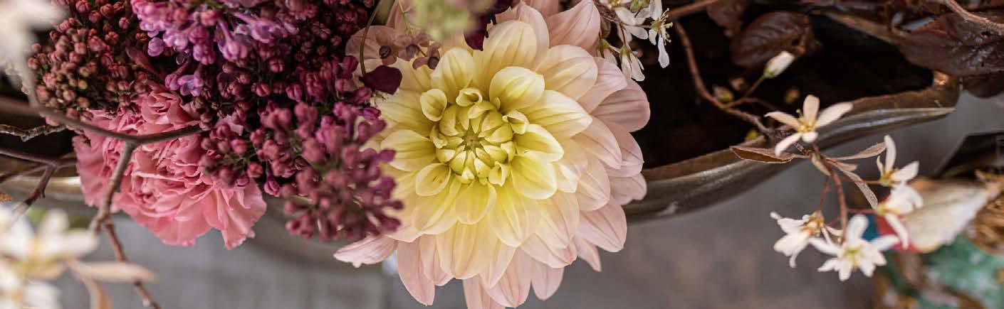 Alternate large flowers with smaller ones and add different heights and dimensions for an enchanting effect. Here, let the big flowers such as roses, dahlias, eustoma and butterfly ranunculus sparkle. Add freesia as a filler for a playful effect.