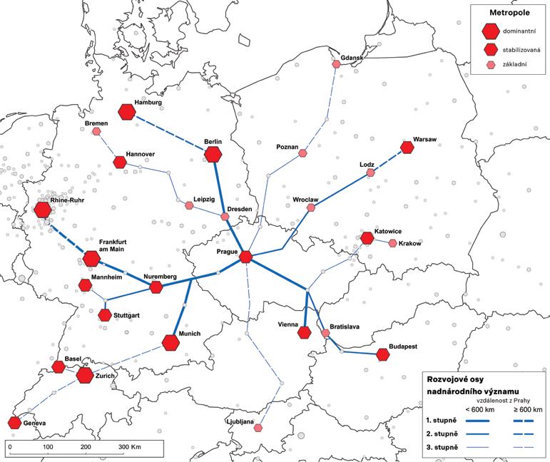 torů charakteristické pro „východní“ středoevropské metropole). Na základě provedených aplikací gravitačního modelu byly následně definovány rozvojové osy nadnárodního významu, které byly rozděleny do tří skupin (viz Viturka, M. a kol., 2010). Nejvýznamnější osy 1. řádu, resp. stupně v rámci České republiky procházejí regiony ORP krajů Středočeského, Plzeňského, Ústeckého, Vysočina a Jihomoravského. V tomto kontextu pak byla mezi evropsky významné metropole zařazena pouze Praha, která se nachází na třech rozvojových osách nejvyššího řádu. Na rozvojové ose nejvyššího řádu se nachází i druhé nejvýznamnější české sídelní centrum Brno (známé pořádáním významných mezinárodních veletrhů), kterému tak lze přiznat pozici vedlejší metropole nadnárodního významu.