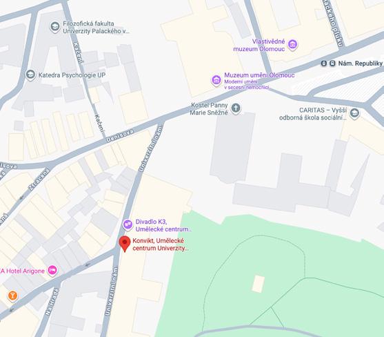 » Umělecké centrum Konvikt se nachází v centru Olomouce (Univerzitní 3, Olomouc).