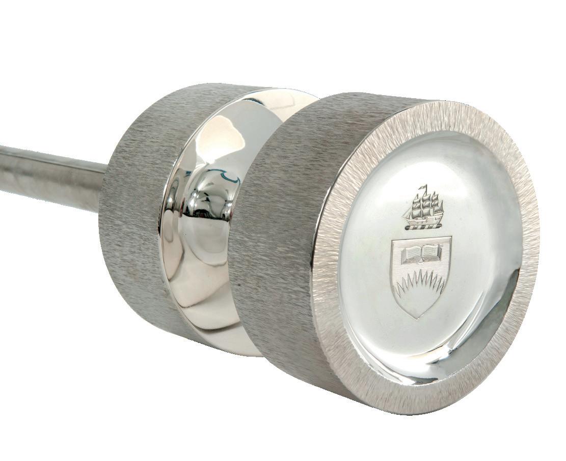 The head of the mace is textured on its outside surfaces and polished on the spindle parts. The crest of Flinders University is engraved on the head; at the lower end of the shaft, there is a smaller replica of the crest of The University of Adelaide and an inscription ‘Given to The Flinders University of South Australia by The University of Adelaide 1969’.