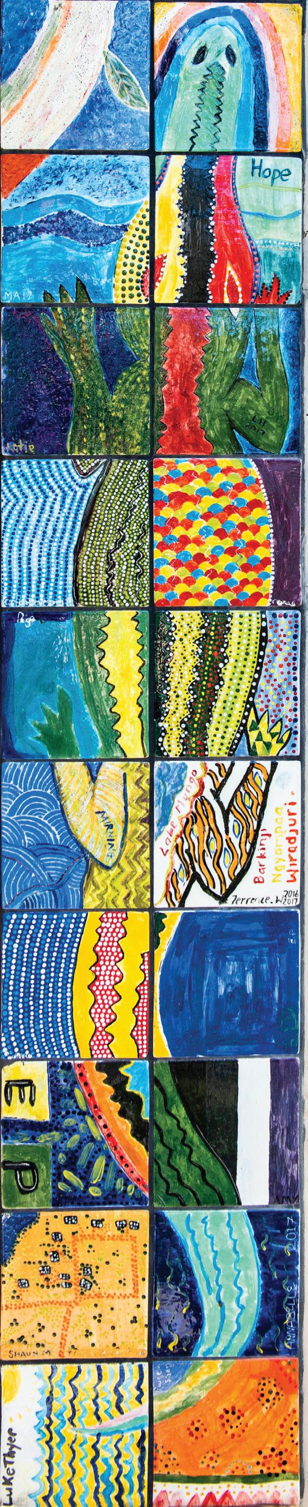 Tiles are designed by Dr. Ali Baker and painted by Aboriginal and Torres Strait Islander students during Orientation week at Flinders University.