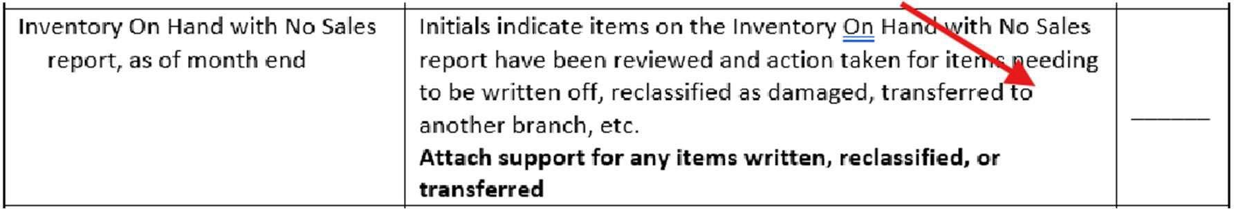 • Once reviewed, initial the first page of the Branch Manager Month-end Certification to the right side of the row ‘Inventory 21on Hand with No Sales report, as of month end’