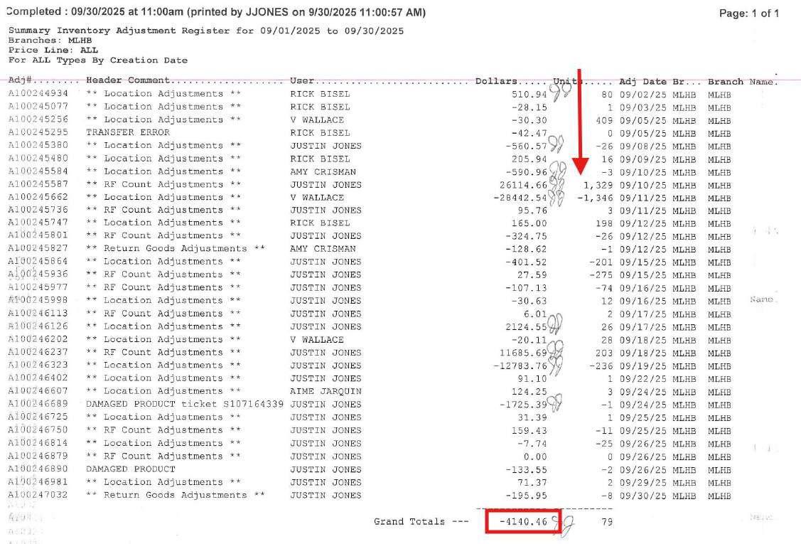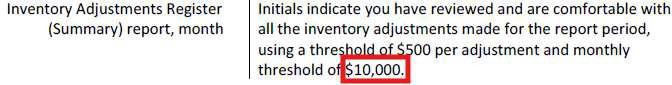 o If the total of the inventory adjustments report is greater than the monthly threshold then items need to be initialed until the adjusted total is below the threshold