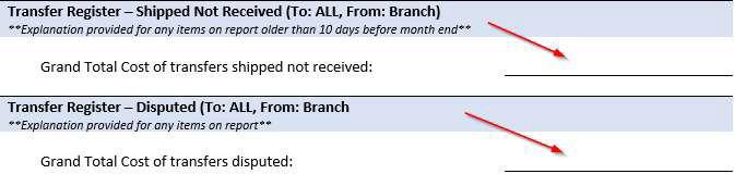 • Once reviewed initial the first page of the Branch Manager Month-end Certification to the right side of the row ‘Transfer Register, Shipped Not Received report Transfer Register, Disputed report’