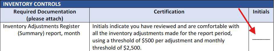 • Once reviewed, initial the first page of the Branch Manager Month-end Certification to the right side of the row ‘Inventory Adjustments Register (summary) report, month’