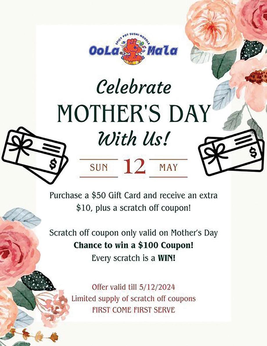 16 | PREMIER FLORIDA Magazine HOURS: MONDAY-THURSDAY: 11:00AM-9:30PM | FRIDAY-SATURDAY: 11:00AM-10:30PM | SUNDAY: 12:00PM-9:30PM SERVING RAMEN NOODLES, UP TO 20 APPETIZERS, BEER, WINE, COCKTAILS & MORE 904.342.0837 1385 St Johns Pkwy (Suite 100 & 101), St Johns, FL www.OolaMala.com ORDER ONLINE! ANY ORDER OF �65 OR MORE �10 OFF ANY ORDER OF �35 OR MORE COUPON REQUIRED. Not valid with any other o ers. COUPON REQUIRED. Not valid with any other o ers. BEFORE TAX BEFORE TAX �5 OFF SPECIALS HOT POT & SEAFOOD BOIL 10% OFF MILITARY DISCOUNT (WITH ID)