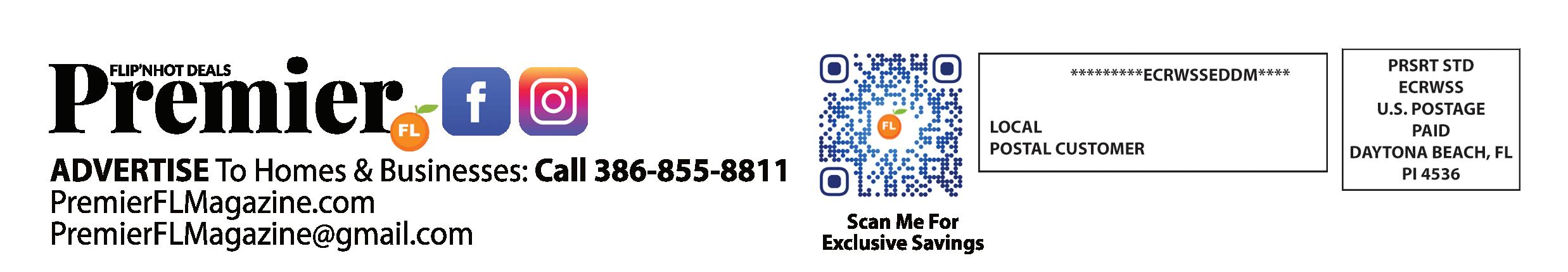 PREMIER FLORIDA Magazine | 15 MAGAZINE ADVERTISE YOUR BUSINESS Reach up to 40,000 Homes per Mail Zone ALL ADS INCLUDE: Professional AD Design | Monthly Changes | Online Ad With Ads As Low As $199 Price is monthly per mailing zone. Markets based on availability. CHOOSE ANY AD SIZE BELOW Business Card Size: �299mo ¼ Page: �399mo ½ Page: �699mo Full Page: �1,099mo 3 MONTHS �199mo* �299mo* �599mo* �999mo* 6 MONTHS �199mo** �299mo** �499mo** �899mo** 12 MONTHS SIGN UP SIGN UP ( + 2 FREE UPGRADES**) *6 Months agreement receives �100 OFF at regular price per market. �100 discount remains after initial 6 months with continuous advertising. **12 months agreement receives Special Pricing + 2 FREE Upgrades to use at any time within the first 12 months. SIGN UP TODAY DON’T WAIT CALL OR SCAN NOW 407.988.2907 PremierFLMagazine.com Premier FL Magazine 30k to 40k Homes Mailed per Month, per Mail Zone VOLUSIA