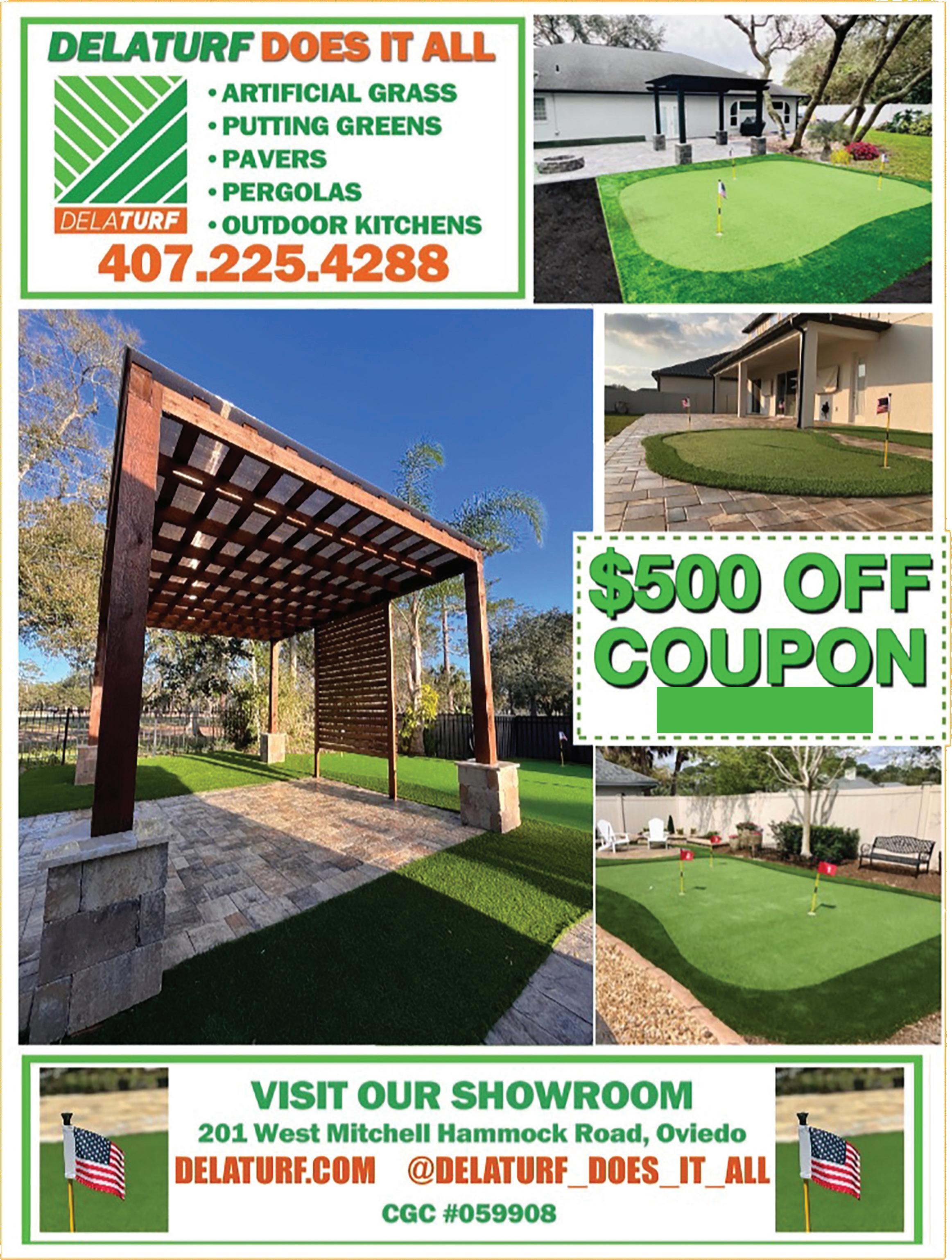 14 | PREMIER FLORIDA Magazine • FREE DEODORIZER • Upholstery Cleaning • Tile & Grout Cleaning • Pet Urine & Odor Removal • On-Site Area Rug Cleaning • Whole Home Odor Removal • Air Duct Cleaning • Dryer Vent Cleaning Gator Clean CARPET • FLOOR CARE • CLEANING SERVICE & MORE! TRY OUR DRY IN 1 HOUR PROCESS 407-915-9176 FAMILY OWNED & OPERATED Kid, Pet & Environmentally Friendly Residential & Commercial Licensed & Insured www.gatorclean.net NO BAIT & SWITCH! Cleaner • Drier • Healthier! 100% EPA Approved Green Products! We Pull More Dirt, Get It Cleaner & Keep It Cleaner Longer Than Anyone Else In The Industry! Carpet Cleaning Done Right, Dries In Hours,Not Days. SUFFERING FROM ALLERGIES? COUPON REQUIRED. NO TRIP CHARGE. $300 minimum. Not valid with any other offer or prior service. Certain restrictions apply 3 Rooms & A Hall or Closet Tile & Grout Cleaning Couch & Loveseat MICROFIBER, LEATHER & SPECIALTY MATERIAL MAY BE EXTRA 3 Rooms & A Hall Low Moisture Cleaning Dryer Vent Cleaning Steam Cleaning Special Up To 200 Sq Ft FREE DEODORIZER DRY IN ONE HOUR CALL FOR DETAILS COUPON REQUIRED. Includes moving of light furniture. Certain restrictions apply. Not valid with any other COUPON REQUIRED. Additional sq. ft. 50¢. Add Sealer COUPON REQUIRED. Not valid with any other offer or prior service. COUPON REQUIRED. Not valid with any other offer or prior service. COUPON REQUIRED. Includes moving of light furniture. Certain restrictions apply. Not valid with any other offer or prior service. $120 Gator Clean $150 Gator Clean $149 Gator Clean $140 Gator Clean Only Includes 7 Vents, 1 Return (Additional Vents $25 Each, Returns $35 Each) AIR DUCT CLEANING $300 $119 Gator Clean STARTING AT 407.270.2998 | DOORRENEW.COM/ORLANDO Stairs | Doors | Cabinets | Furniture Don’t Replace... Renew! WOOD REFINISHING FIRST DOOR MUST PRESENT COUPON at time of estimate. Cannot be combined with other o ers. �50 OFF COUPON REQUIRED Purchase of 100 linear ft. or more. Not valid with any other o ers. FREE GATE WITH A WHITE VINYL FENCE INSTALLATION FENCE INSTALLATIONS VINYL � ALUMINUM � WOOD � CHAIN LINK CALL NOW TO SCHEDULE YOUR FREE ESTIMATE! 407.634.6299 WWW.FENCEMALLFL.COM 12 MONTHS FINANCING AVAILABLE! 0% INTEREST CALL FOR DETAILS! RESIDENTIAL & COMMERCIAL