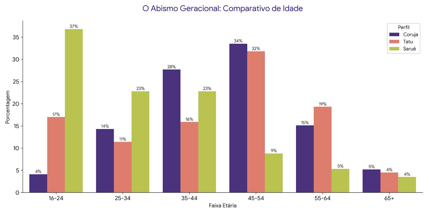Faixa etária: Predominantemente madura. 61% têm entre 35 e 54 anos, com o pico principal na faixa de 45–54 anos (33,5%).