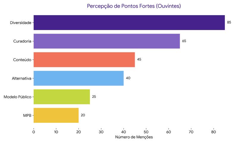 1.Diversidade e ecletismo (85 menções): o ouvinte valoriza não ouvir "mais do mesmo".