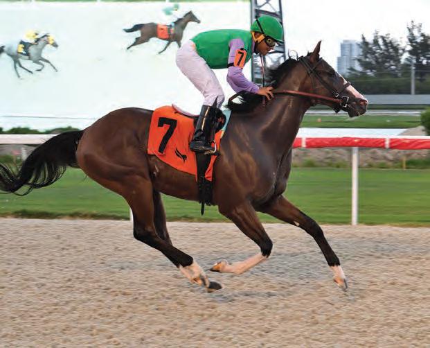 Although Rodney G. Lundrock’s homebred Maryquitecon trary was the only 3-year-old among the eight fillies and mares in the $65,000 Sheer Drama, the lightly raced daughter of Dou ble Diamond Farm stallion First Dude lived up to her 9-5 favor itism with a neck victory in the seven furlong contest for Floridabreds at Gulfstream Park on Sept. 10. The Sheer Drama offered a $35,000 supplement for a Florida Sire Stakes-eligible winner pre sented by the Florida Thorough bred Breeders’ and Owners’ Association, however, Maryquite contrary did not qualify.