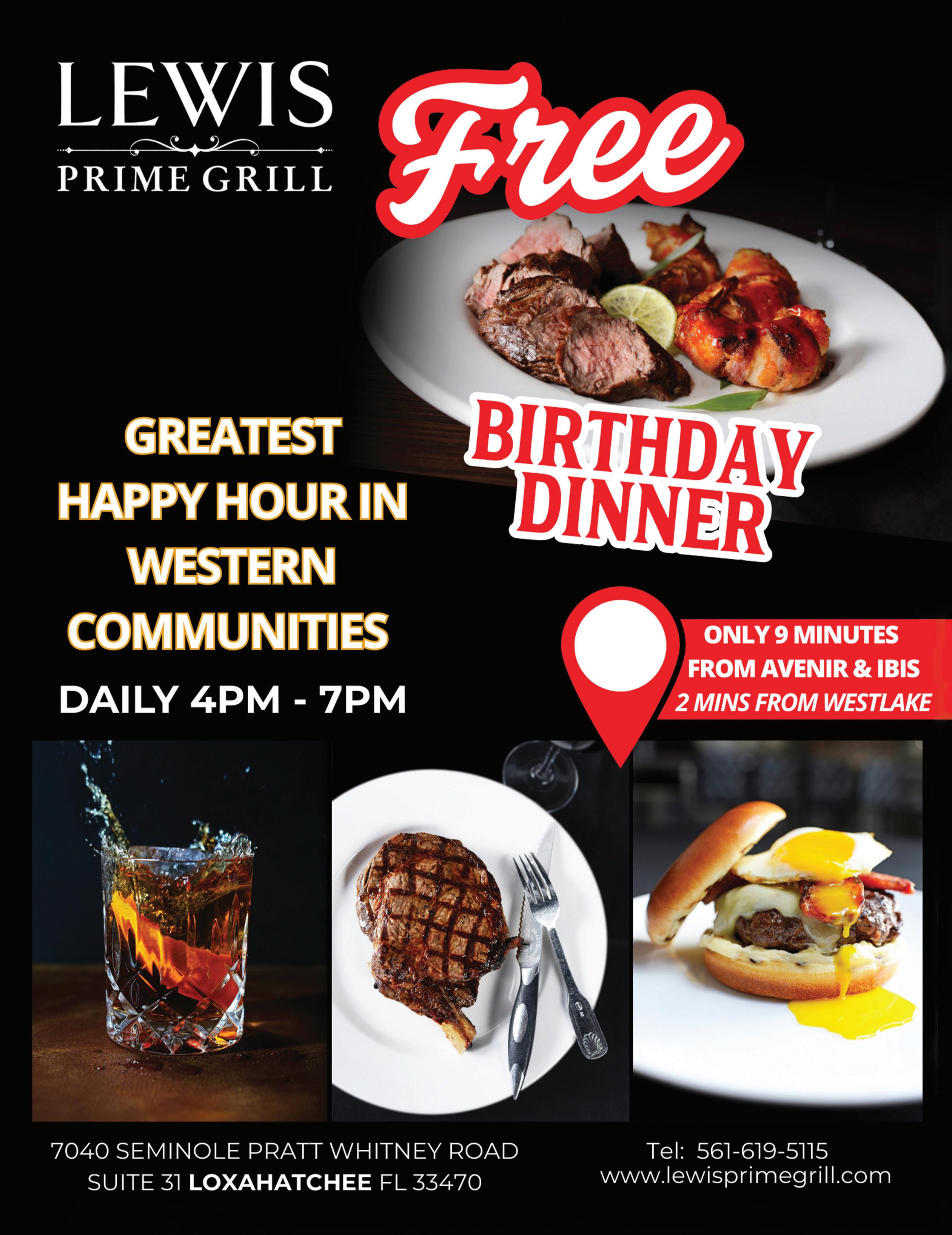 Lewis Prime Grill is located at 7040 Seminole Pratt Whitney Road, Suite 31, at the corner of Seminole Pratt and Orange Blvd. in the Publix plaza. For more information, call (561) 619-5115 or visit www.lewisprimegrill.com.