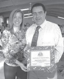 Top Teacher — Dwyer Award winner Sandra Coster holds her trophy as she stands with Wellington Landings Middle School Principal Mario Crocetti at the Kravis Center on Monday.