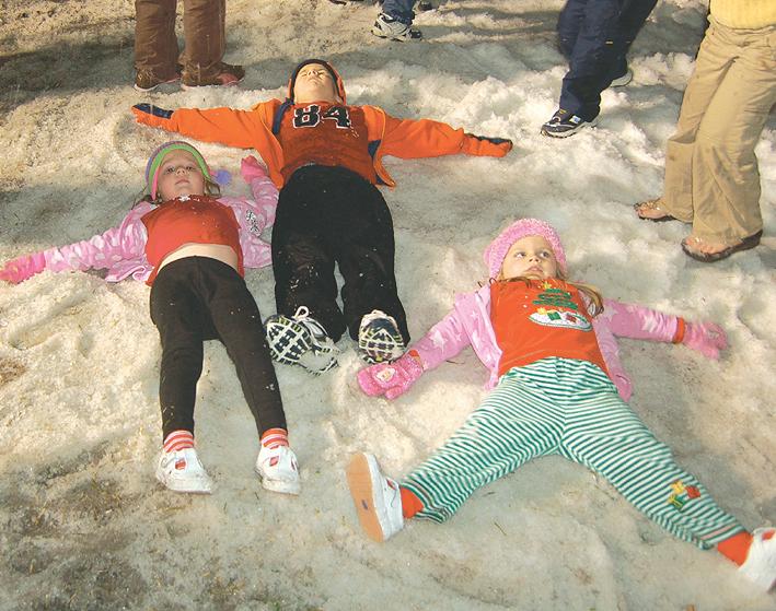 Jenna, Jonathan and Julia Cobb make snow angels.Sydney, Nicole, Scott and Megan Staup.