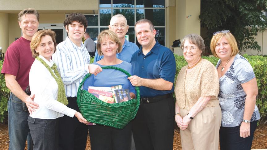 (Above) Keely Spinelli’s family helps Binks Forest Elementary School Media Specialist Sharon Wedgworth with the first basket of donated books for Keely’s Place. (L-R) Al Salopek, Keely Salopek, Drew Spinelli, Dr. Tom Salopek, Peter Spinelli, Mary Salopek and Cindy Guinn. (Left) Palms West Hospital representatives at the event included (L-R) Silvia Stradi, Blair Heath, Lori Kimmel, Joe Debiase, Mike Patterson, Dr. Ira Stein, CEO Bland Eng, Bobby Ewing, Dr. Alberto Marante, Dr. Larry Bergman, Nori Skalka, Dr. Carmine Priore, Jamie Taylor, Renee Burke and Mary Jo Walsh Watson. PHOTOS BY CANDACE MARCHSTEINER/TOWN-CRIER