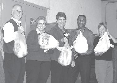 On Wednesday, Nov. 19, administrators and department managers at Wellington Regional Medical Center prepared to distribute turkeys as a thank-you to its employees and volunteers. Some of the employees chose to donate their turkeys to the Salvation Army. Pictured left are (L-R) Chief Financial Officer Woody White, Case Management Director Karen Medoff, Orthopedic Unit Director Anja Hehmann, Health Information Management Director Philip Baker and recruiter Jennifer Wilson.