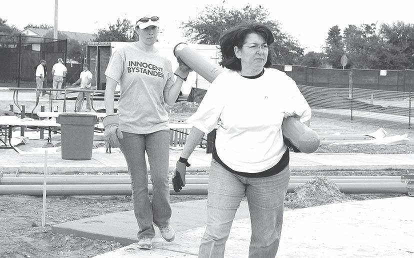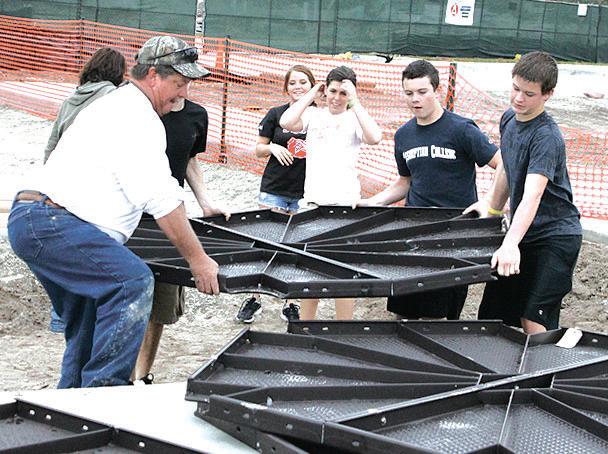 Volunteers help move the bases of the