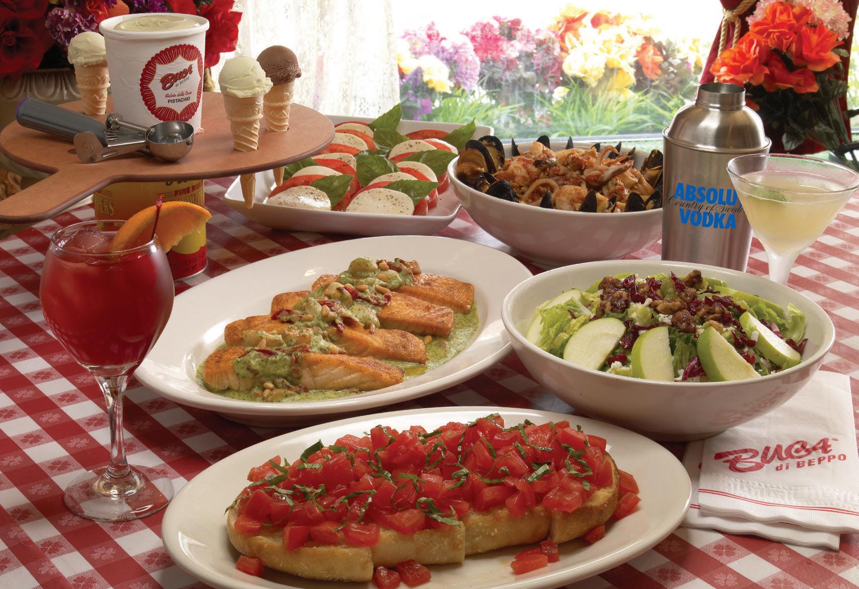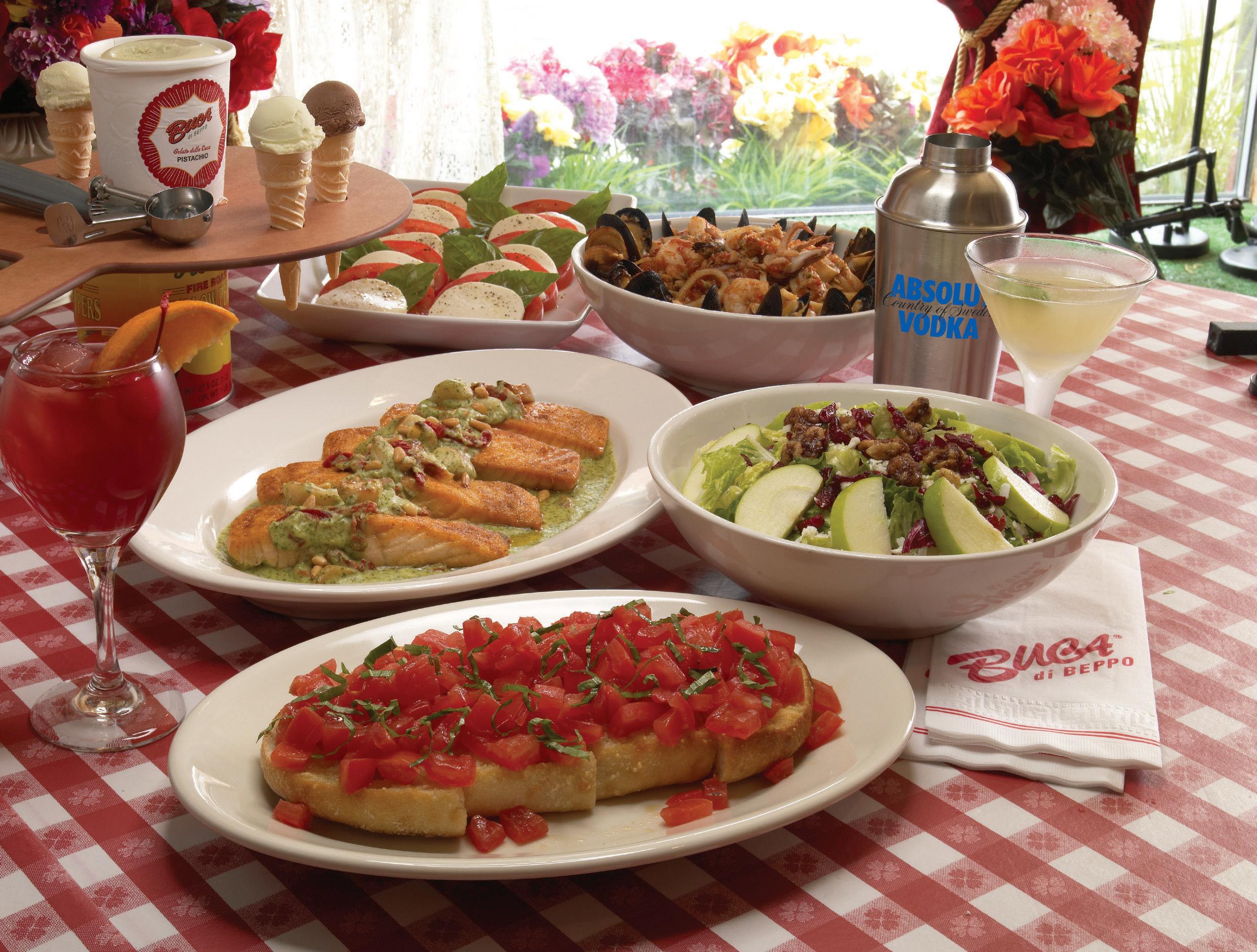 Buca di Beppo gets to the heart of fresh Italian cooking with our new summer menu featuring Mozzarella Caprese, Linguine Frutti di Mare, Oven-Roasted Salmon, Apple Gorgonzola Salad and Gelato della Casa. At Buca, we serve family-style meals in two portion sizes. Buca Small™ feeds two to three and Buca Large™ feeds an average-size country. Well, actually it feeds four to six.