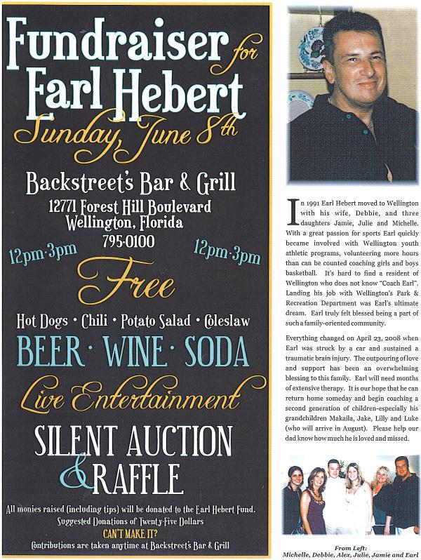 • A fundraiser will be held Sunday, June 8 from noon to 3 p.m. at Backstreets Bar & Grill for Earl Hebert, a Wellington man who was struck by a car on April 23 and sustained a traumatic brain injury. Hog dogs, chili, potato salad, coleslaw, beer, wine and soda will be served, and there will be live entertainment. The suggested donation is $25. There will also be a silent auction and raffle. Proceeds raised, including tips, will be donated to the Earl Hebert Fund. Contributions will be taken any time at Backstreets, located at 12771 W. Forest Hill Blvd. in Wellington. For more info., call (561) 795-0100.
