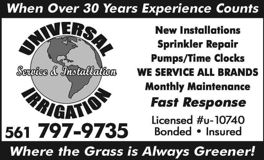 AQUATIC SPRINKLER, LLC - Complete repair of all types of systems. Owner Operated. Michael 561-9646004 Lic. #U17871 Bonded & Ins. Serving the Western Communities Since 1990 AT YOUR SERVICE TRANSPORTAirports, Hospitals, Dr. appt's, shopping trips. 561-632-2999 or leave message at 793-7652. Wellington Resident. Lincoln Town-Car. Lic. & Ins. #1708