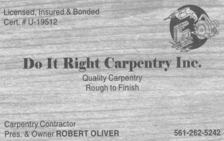 BILLY’S HOME REPAIRS, INC. — Interior Trim, crown molding, rottenwood repair, door installation, minor drywall, kitchens/cabinets/countertops, remodeling, wood flooring. Bonded/Insured U#19699. 561-791-9900 Cell: 561-3705293