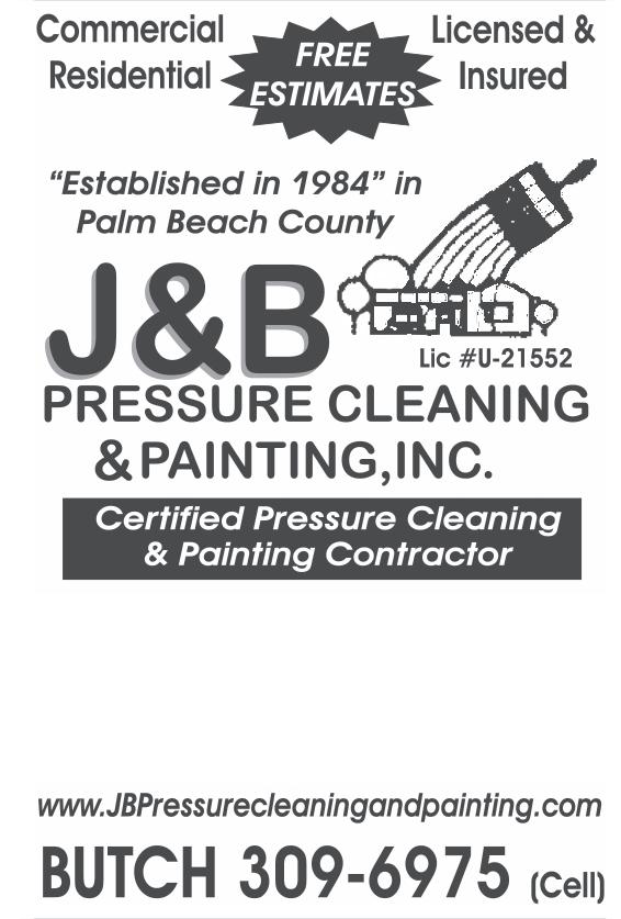 All Types of Pressure Cleaning, Chemical Roof Cleaning, Houses, Driveways, Patios, etc. and Interior/Exterior Painting SOUTH FLORIDA WEB ADVISORS, INC. WEBSITE AND SOCIAL MEDIA DESIGN, HOSTING AND OPTIMIZATION PHILIP LEVINE PRESIDENT 7525 NORTHPORT DRIVE BOYNTON BEACH, FL 33472 561-337-7806 PHILlp@SFLWA.NET HTTP)IWWW.SFLWA.NET Sean Fucarile PRESIDENT CFCA32568 email: sean@seacoastsepticandplumbing.com web: seacoastsepticandplumbing.com 561-478-7878 561-719-9361 WELLINGTON • ROYAL PALM BEACH • LOXAHATCHEE • THE ACREAGE “Let the Poo Crew come to you” For all your Septic and Plumbing needs! www.poo-man.com poomanpumping247@gmail.com 561-318-8416 561-540-5929 CLASSIFIEDS WELLINGTON • ROYAL PALM BEACH • LOXAHATCHEE • THE ACREAGE A/C Refrigeration Services JOHN C. HUNTON AIR CONDITIONING & REFRIG ERATION, INC.—Service & new installation Lic. CAC 057272 Ins. “We are proud supporters of the Sem inole Ridge Hawks” 561-798-3225. Family Owned & Operated since 1996. Credit Cards Accepted Cleaning - Home/Office CLEANING LADY — I can help get your house cleaner than ever! Try me once and you will not be disappointed! 561-657-0420 Cleaning & Pet Sitting NEED YOUR HOUSE CLEANED, AND OR YOUR PETS WATCHED ? I guarantee you will not be disappointed. Honest, Reliable. Call 561-598-0311 Electrical Contractor SINGER ELECTRICAL CONTRACTING, INC. Electrical work you can trust at an affordable price, Fully Licensed and Insured. EC#13007941 561-425-5409 Home Improvement ANMAR CO.— James’ All Around Handyman Ser vice. Excellent craftsman Old time values. Once you’ve had me! You’ll have me back! Lic. Ins. Certified Residential Contractor CRC1327426 561-248-8528 Painting J&B PRESSURE CLEANING & PAINTING, INC. — Established 1984. All types of pressure clean ing, Chemical Roof Cleaning, houses, driveways, patios etc. Commercial & Residential. Interior & Exterior painting. Certified -pressure cleaning & painting contractor. Lic. #U21552 Call Butch 309-6975 or visit our website at www.jbpressurecleaningandpainting.com JOHN PERGOLIZZI PAINTING INC. — Interior/Ex terior - Repaint specialist, pressure cleaning, popcorn ceiling, drywall repair & roof painting. Family owned/ owner operator. Free Est. 798-4964 Lic. #U18473 PLACE YOUR AD HERE CALL 561-793-7606 Plumbing POO-MAN — Pumping, plumbing, & drain cleaning. For all your septic & plumbing needs! Let the Poo Crew come to you. 561-318-8416 Roofing ROBERT G. HARTMANN ROOFING — Spe cializing in repairs. Free estimates, Bonded,in sured. Lic. #CCC 058317 Ph: 561-790-0763. ROOFING REPAIRS RE-ROOFIG ALL TYPES — Pinewood Construction, Inc. Hon est and reliable. Serving Palm Beach Coun ty for over 20 years. Call Mike 561-309-0134 Lic. Ins. Bonded. CGC-023773 RC-0067207 NEIL O’NEAL JR. ROOFING Roofing & Re roofing. Family owned and operated. Residential/ Commercial. Wood Replacement, Roof Coatings, Solar Vents, Skylights & Roof Ventilation. 561-6564945 Lic. & Insured CCC1330208.Free Estimates The Town-Crier www gotowncrier com October 7 - October 20, 2022 Page 29