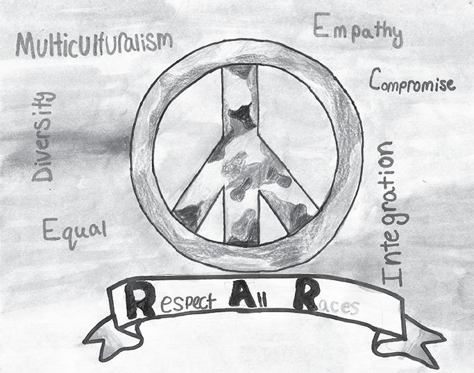 (Above) Art teacher Erica Bor donaro and student Florence Phillips in front of Wellington Rotary Peace Park. (Inset) The world peace poster submitted by Florence Phillips.