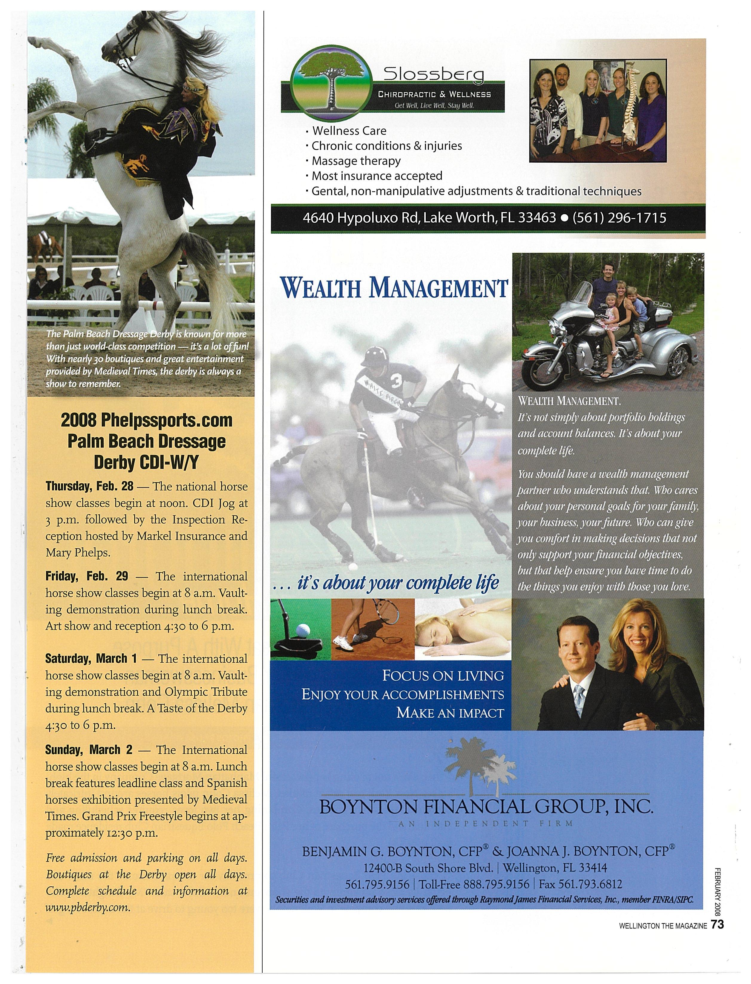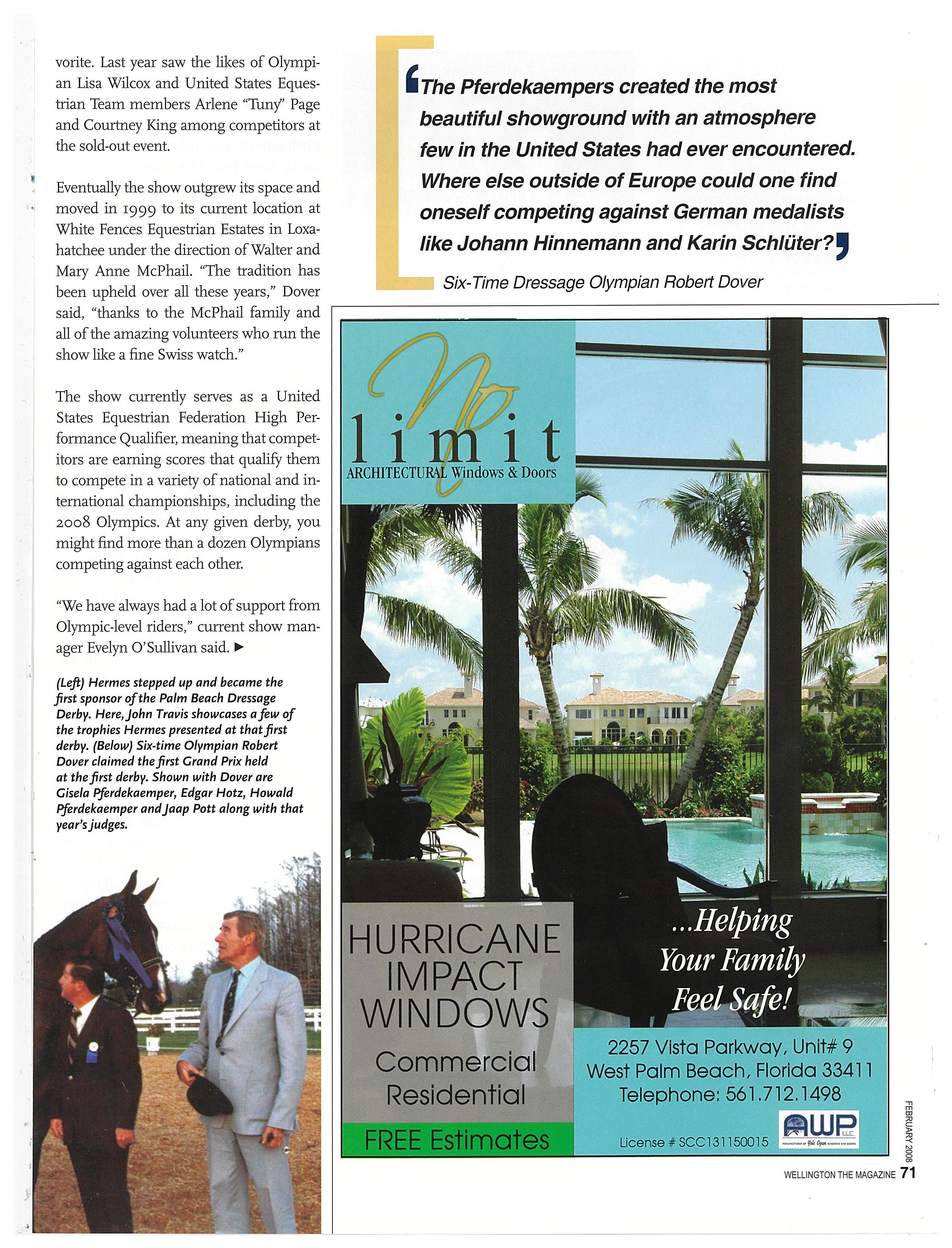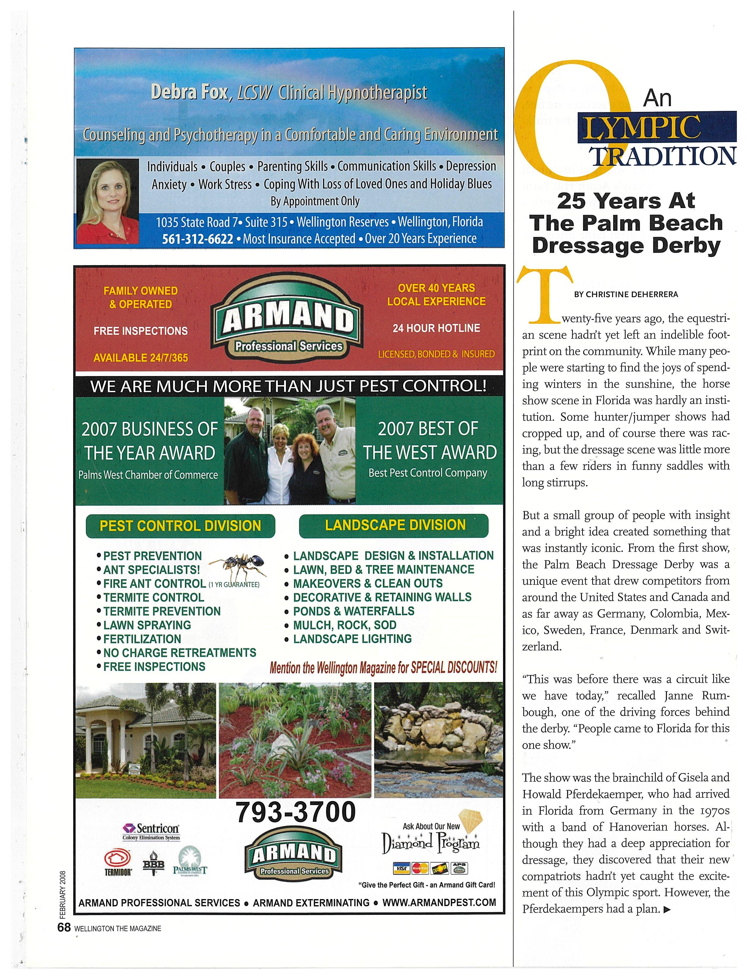 WELLINGTON THE MAGAZINE – February 2008 ON THE COVER: Amanda Varney and Dan Murphy model dressage fashions from Euro American Saddlery Hair and makeup by Derna Lopez of Capricious Salon. Shot on locatlon at Mosquito Mound Farm In Wellington. PHOTO BY HOLLY HEALY