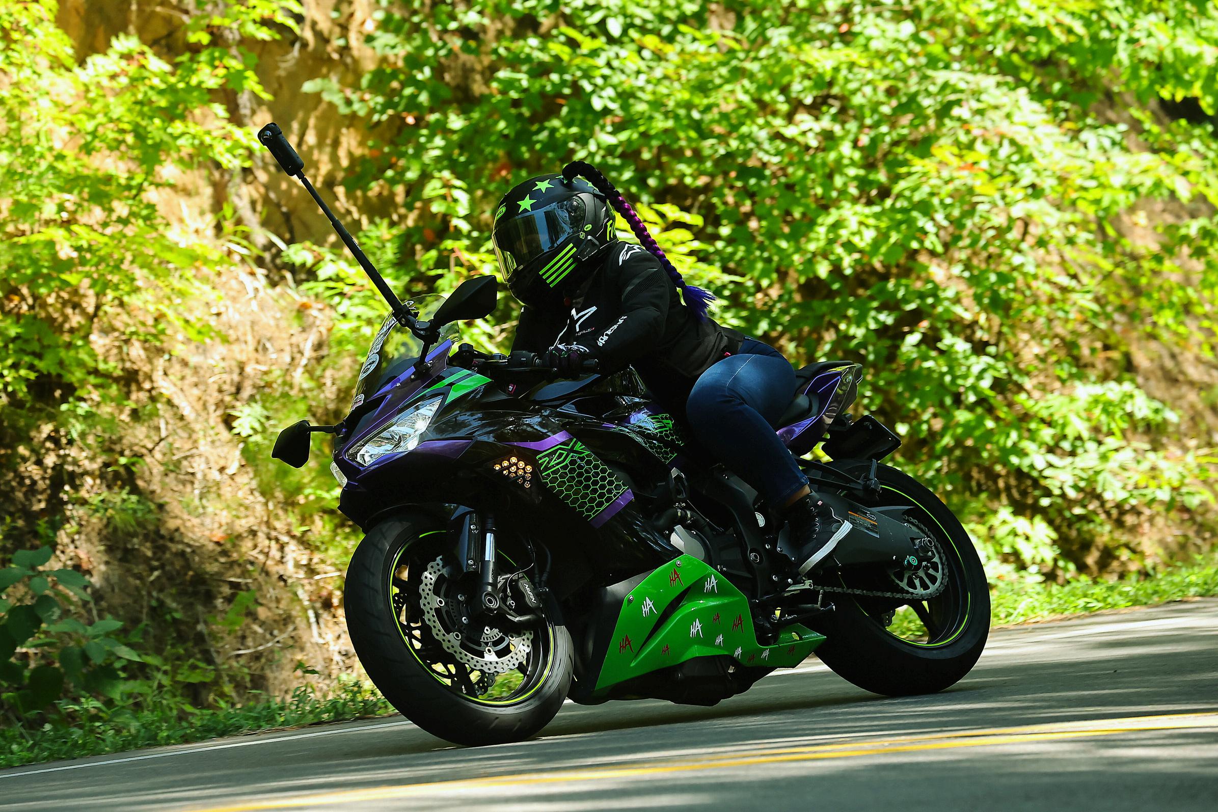Crystal rides a ZX-6R, which she lovingly named Joker She has outfitted it with a complete fairings kit, an M4 exhaust, and has lowered it by two inches addressing the challenges of being a shorter rider with flair. Joker represents more than just a motorcycle; it symbolizes her freedom, her escape, and her connection to a community that feels like family.