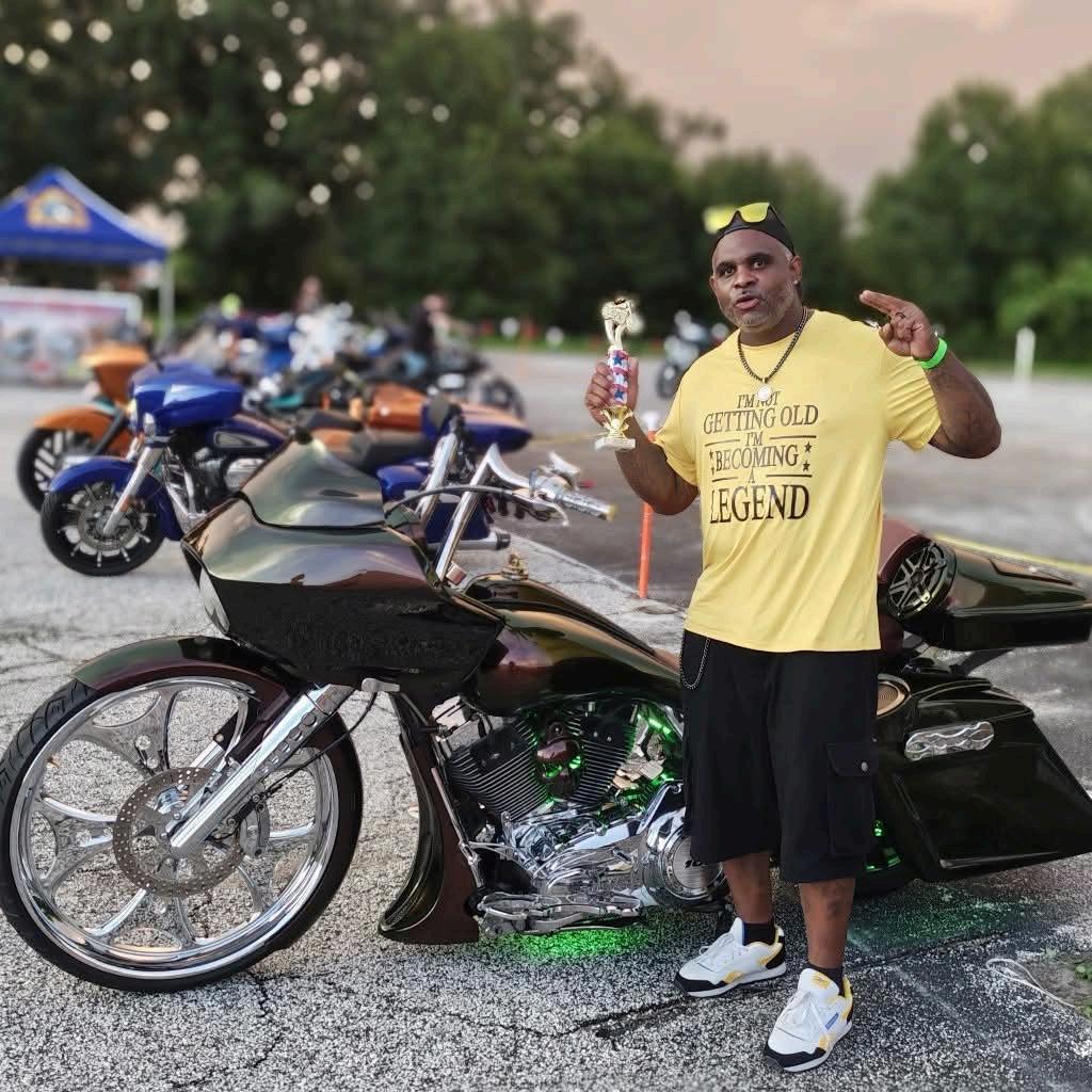 My name is Torrey Paige. I’m 48 and originally from Crewe, Virginia, now living in Tampa for three years. I ride a 2013 Harley Davidson Road Glide named KAMORA because of its shifting paint that changes to the same colors found in cash. It’s shining with chrome, gold touches, and a strong 26‑inch front wheel.