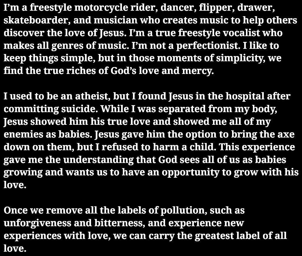 A part of my testimony is that I got into freestyle stunt riding because my late fiancé, Olivia, had a goal for us to ride in parking lots and perform shows in a safer environment God led me to my current wife, Kaitlynn. Together, we perform stunt shows and spread our faith and love for others, encouraging and uplifting people