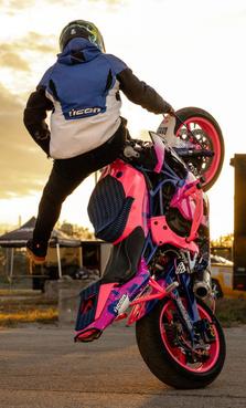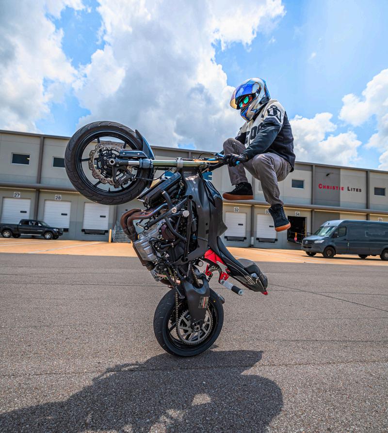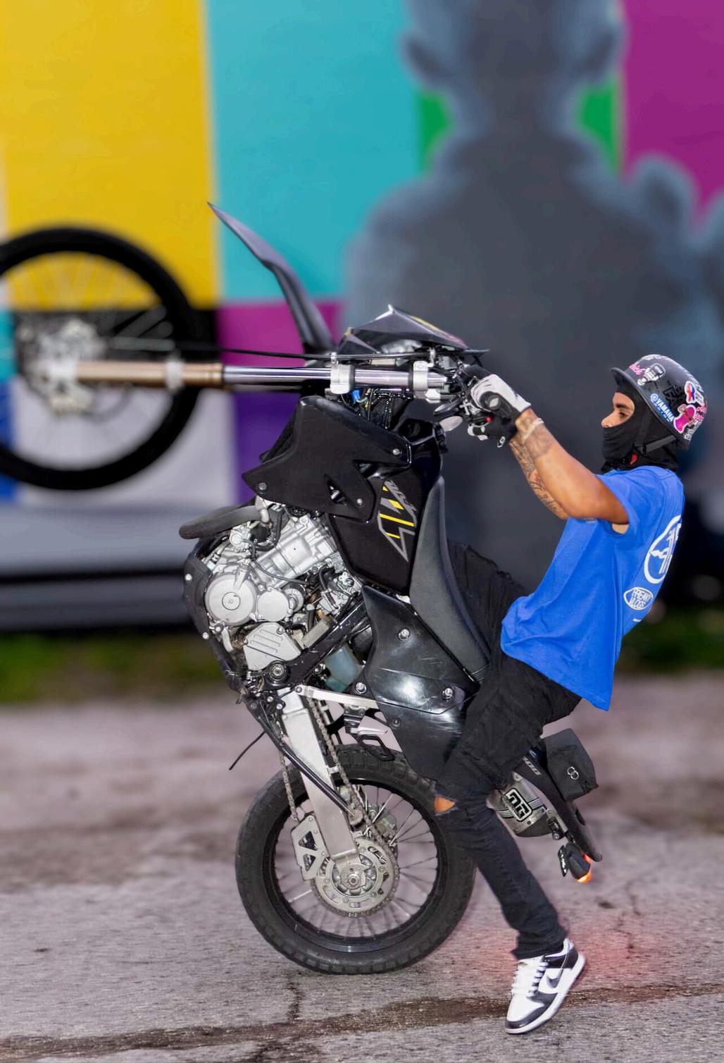 What got me into stuntriding was growing up. Around my uncles, both of whom rode BMX professionally and then transitioned to street bikes, I thought it was the coolest thing. I ended up getting my first street bike at the age of 17, which was a 2003 Honda F4i I learned everything I know on that bike I also grew up watching Jesse Toler ride. I was hooked! I knew I needed to accomplish that trick, so I ended up competing at one of his events called the AM Stoppie School I ended up getting my 500ft stoppie stickers, also known as the High Rollers Club. It’s always been a big goal of mine