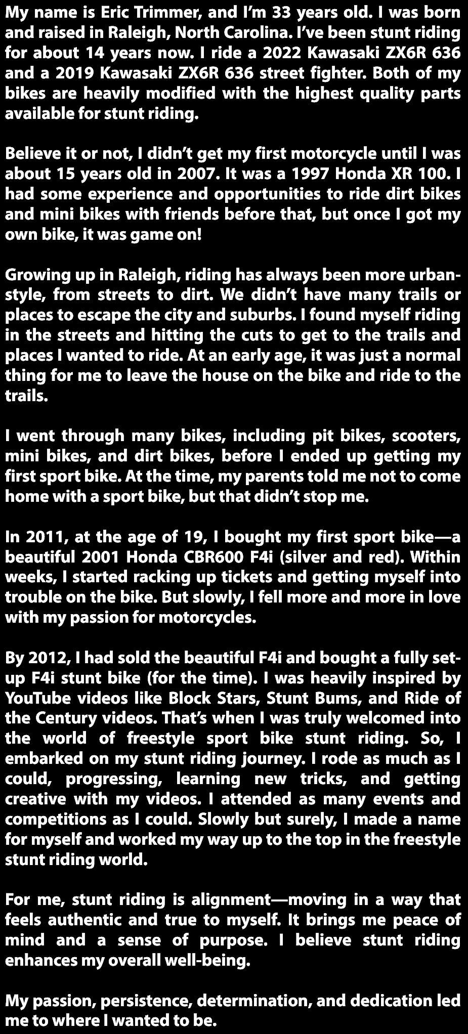 I’m not entirely sure why I chose riding. I was originally a skateboarder aiming to turn pro and was close to doing so. One day, I simply set the board down and got on a motorcycle I felt more connected to the bike and found it to be a better and more enjoyable way to express myself through an extreme sport I still ride because I love it, and just sitting on a bike allows me to think and feel positively. The best advice I can give anyone is to wear gear and a helmet if you truly ride. I wouldn’t be alive today if it weren't for the gear I wear Also, take care of your machine and upgrade parts and equipment so you can ride at your best Learn your machine and understand it, and you'll learn to ride even faster and better