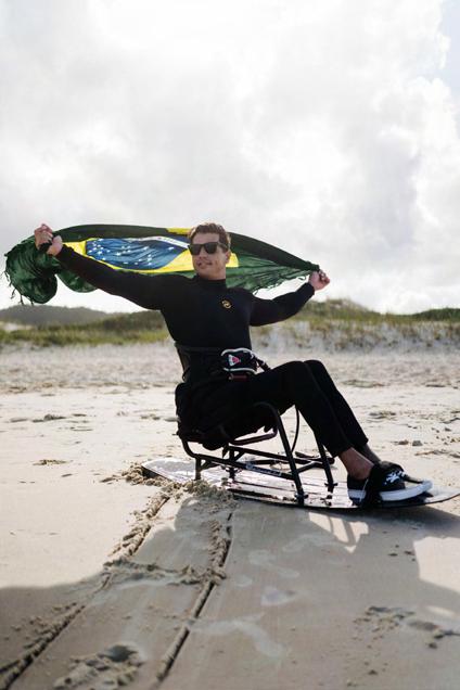 Foi uma questão de criar a forma mesmo, de como o meu corpo teria que se portar, porque eu velejo de uma forma direcional, como se fosse alguém em uma prancha de Wave, eu tive que descobrir como é a posição ideal do meu corpo, eu imaginava que iria velejar de frente para a pipa e na verdade eu velejo de lado pra ela, e quando eu vou saltar, estou praticamente dando as costas para a pipa, estou jogando ela atrás de mim, ao meio dia e as vezes até passa um pouquinho pra ganhar mais pressão…e puxo a barra pra eu poder saltar e pra você ter uma ideia, no começo eu abri um buraco de uns 10 cm no meu abdómen, de tanto esforço que eu fazia na parte abdominal e fiquei 8 meses com esse buraco… era o jeito que tinha pra eu velejar, então foi uma descoberta e de 2018 pra cá uma evolução absurda né!”